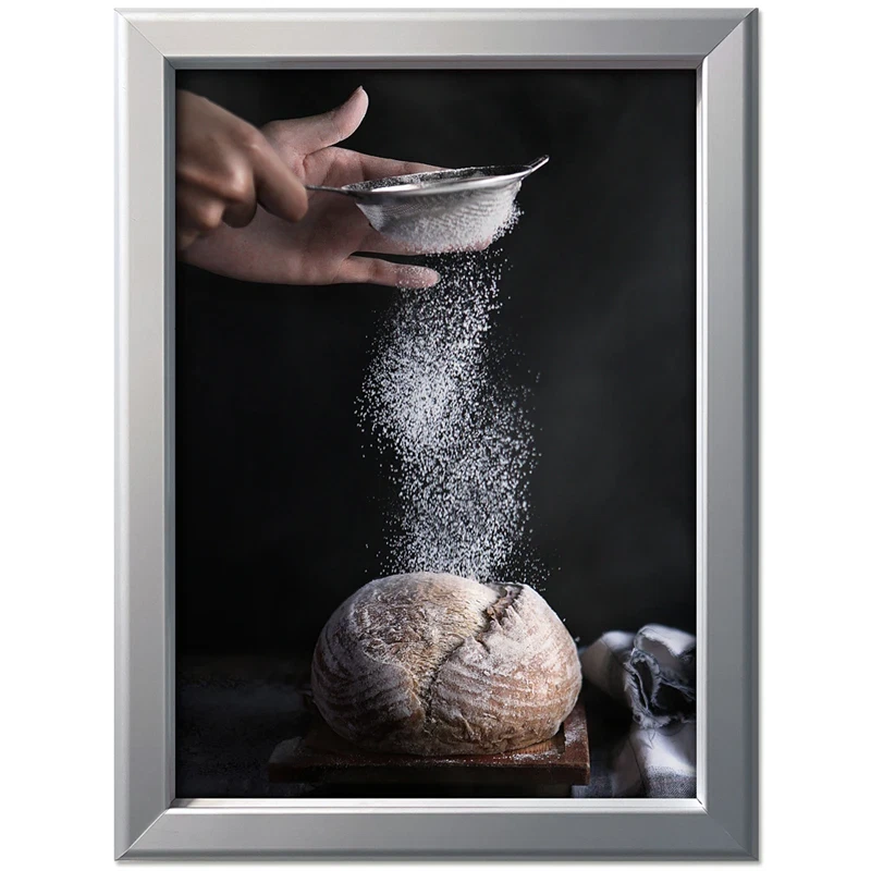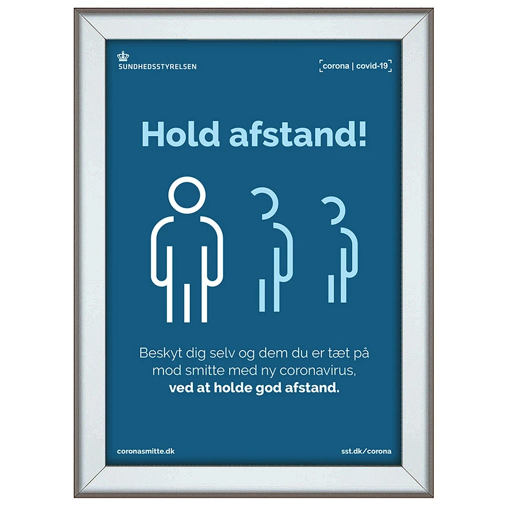 Sølveloxeret aluminium A3 klapramme med 32 mm profil og hjørner i gering. 1,5 mm PS bagplade samt APET antirefleks frontplade. Inklusiv skruer og plugs til montering.