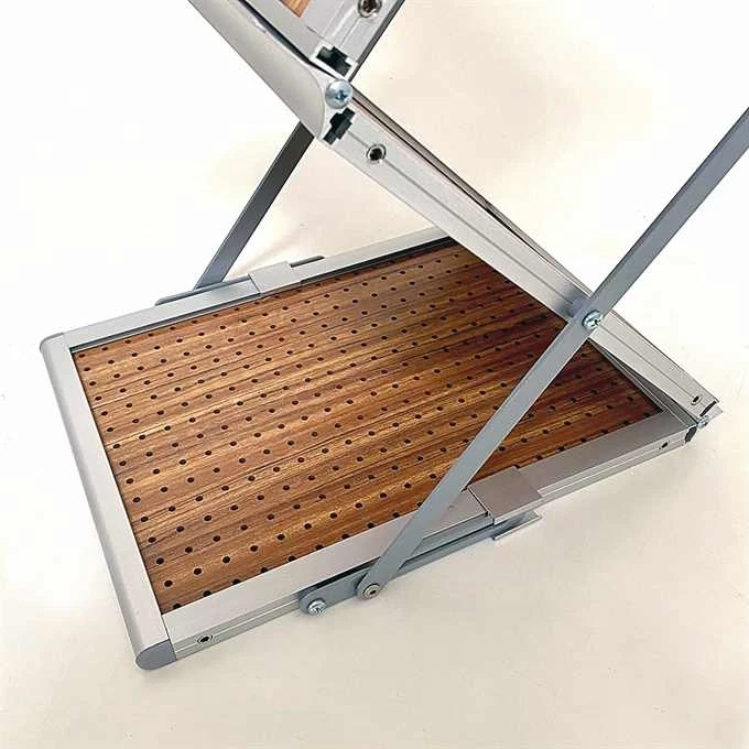 Sammenklappelig brochurestander med 6 træhylder til A4 brochurer. Let udførelse i sølveloxeret aluminium. Enkel og hurtig at sætte op. Leveres i en sølvfarvet aluminiumskuffert med polstring.